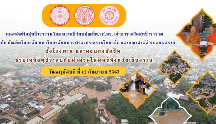 พระสุธีรัตนบัณฑิต,รศ.ดร. เจ้าอาวาสวัดสุทธิวราราม ร่วมกับ บัณฑิตวิทยาลัย #มหาวิทยาลัยมหาจุฬาลงกรณราชวิทยาลัย และ คณะสงฆ์อำเภอแม่สรวย นำโดย หลวงพ่อพระมหาสุบรรณ มหาคมฺภีโร เจ้าอาวาสวัดเจดีย์หลวง เจ้าคณะอำเภอแม่สรวย จัดตั้งโรงทานและมอบถุงยังชีพ เพื่อช่วยเหลือผู้ประสบภัยน้ำท่วมในพื้นที่จังหวัดเชียงราย