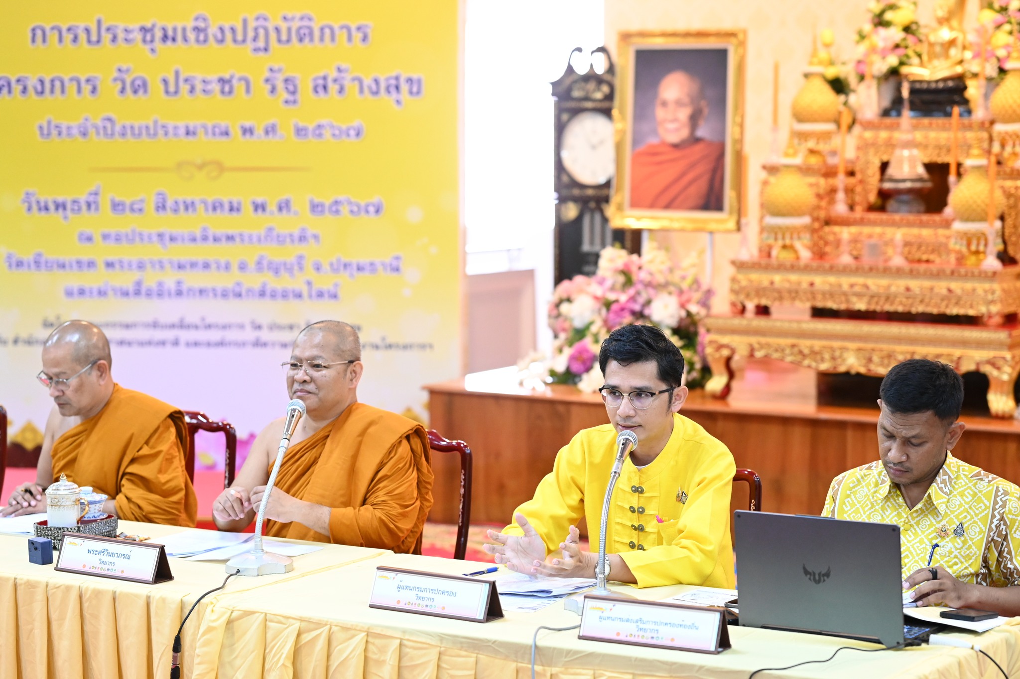 นอกจากนี้ ยังมีผู้เข้าร่วมการประชุมฯ Online ผ่านสื่ออิเล็กทรอนิกส์ออนไลน์ระบบซูม (Zoom Cloud Meetings), รับชมการถ่ายทอดสดทาง Facebook และ Youtube ประกอบด้วย ประธานฝ่ายสาธารณูปการของคณะสงฆ์ ประจำจังหวัด ทุกจังหวัด, ผู้อำนวยการสำนักงานพระพุทธศาสนา ประจำจังหวัด ทุกจังหวัด และท้องถิ่นจังหวัด ทุกจังหวัด ทั่วประเทศ จำนวนรวมกว่า 2,000รูป/คน เข้าร่วมการประชุมฯ สมเด็จพระมหาวีรวงศ์ กรรมการมหาเถรสมาคม, ประธานกรรมการฝ่ายสาธารณูปการ ของมหาเถรสมาคม, ประธานกรรมการอำนวยการ ขับเคลื่อนโครงการ วัด ประชา รัฐ สร้างสุข กล่าวว่า “หัวใจของโครงการวัด ประชา รัฐ สร้างสุข คือ กลไกการสร้างสายสัมพันธ์ความร่วมแรงร่วมใจกันของวัด ชุมชน และภาคเครือข่ายในท้องถิ่นด้วยอุดมการณ์ร่วมกัน คือ ศรัทธาปสาทะในบวรพระพุทธศาสนา และเจตจำนงให้วัดเป็นสถานสัปปายะ อำนวยสันติรสแก่ผู้เข้ามาพึ่งพาบำบัดทุกข์ และเสริมสร้างความสุขทั้งแก่กายและใจ อันจะนำไปสู่ความวัฒนาสถาวรของชาติและสถาบันพระพุทธศาสนา ด้วยเหตุนี้ จึงจำเป็นที่ทุกภาคส่วนต้องเพิ่มพูนสามัคคีธรรมให้งอกงามไพบูลย์ขึ้นในใจตน ในชุมชน และในประเทศชาติ ร่วมกันส่งเสริมให้มีกิจกรรมและองค์ความรู้ 5ส ไปสู่การปรับปรุงสภาพภูมิทัศน์ การจัดการสิ่งแวดล้อม และรักษาความสะอาดภายในวัดให้ถูกต้องตามสุขลักษณะ และการพัฒนาการเรียนรู้ทางสังคมวิถีพุทธ รวมทั้งการมีจิตอาสาเพื่อการพัฒนาสังคม มีฉันทะและมีความสามัคคีต่อกันแบบนี้ พลังความสามัคคีจะก่อให้เกิดประโยชน์สุข และยิ่งมีการจับคู่การพัฒนากันมากขึ้น ก็จะทำให้โครงการนี้สัมฤทธิผล วัด ชุมชน และของชาติ ก็จะยังประโยชน์ให้เกิดพลังสร้างสรรค์ยิ่งๆ ขึ้นไป”
