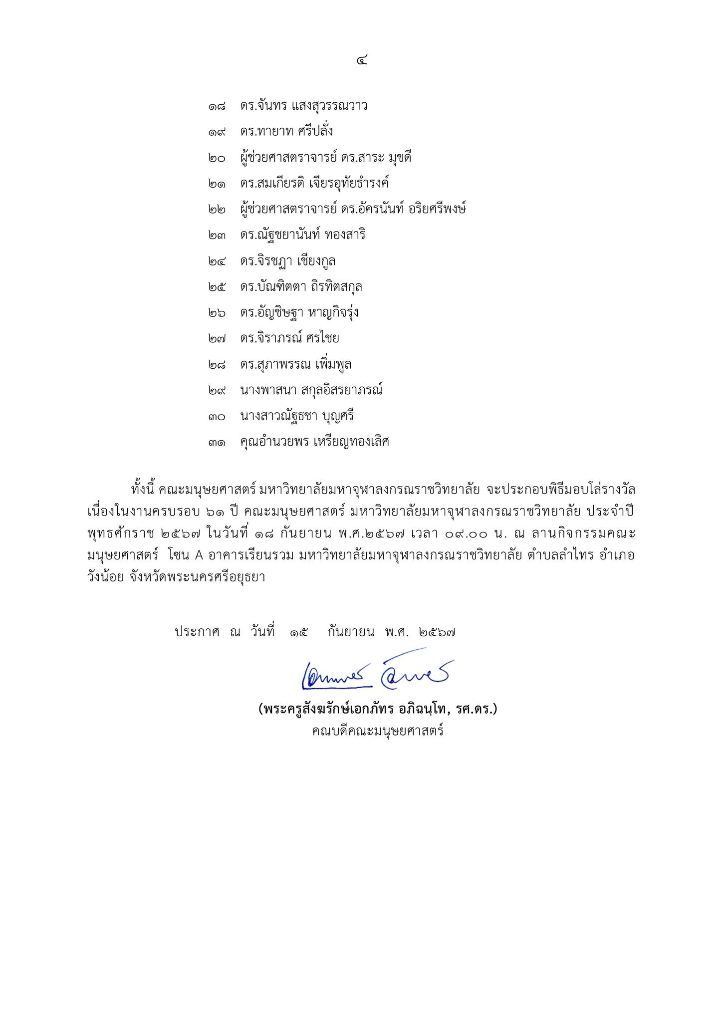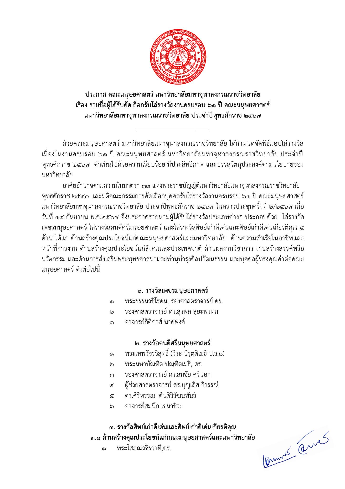 ประกาศ รายชื่อผู้ได้รับคัดเลือกรับโล่รางวัลงานครบรอบ ๖๑ ปี คณะมนุษยศาสตร์ ประจำปีพุทธศักราช ๒๕๖๗