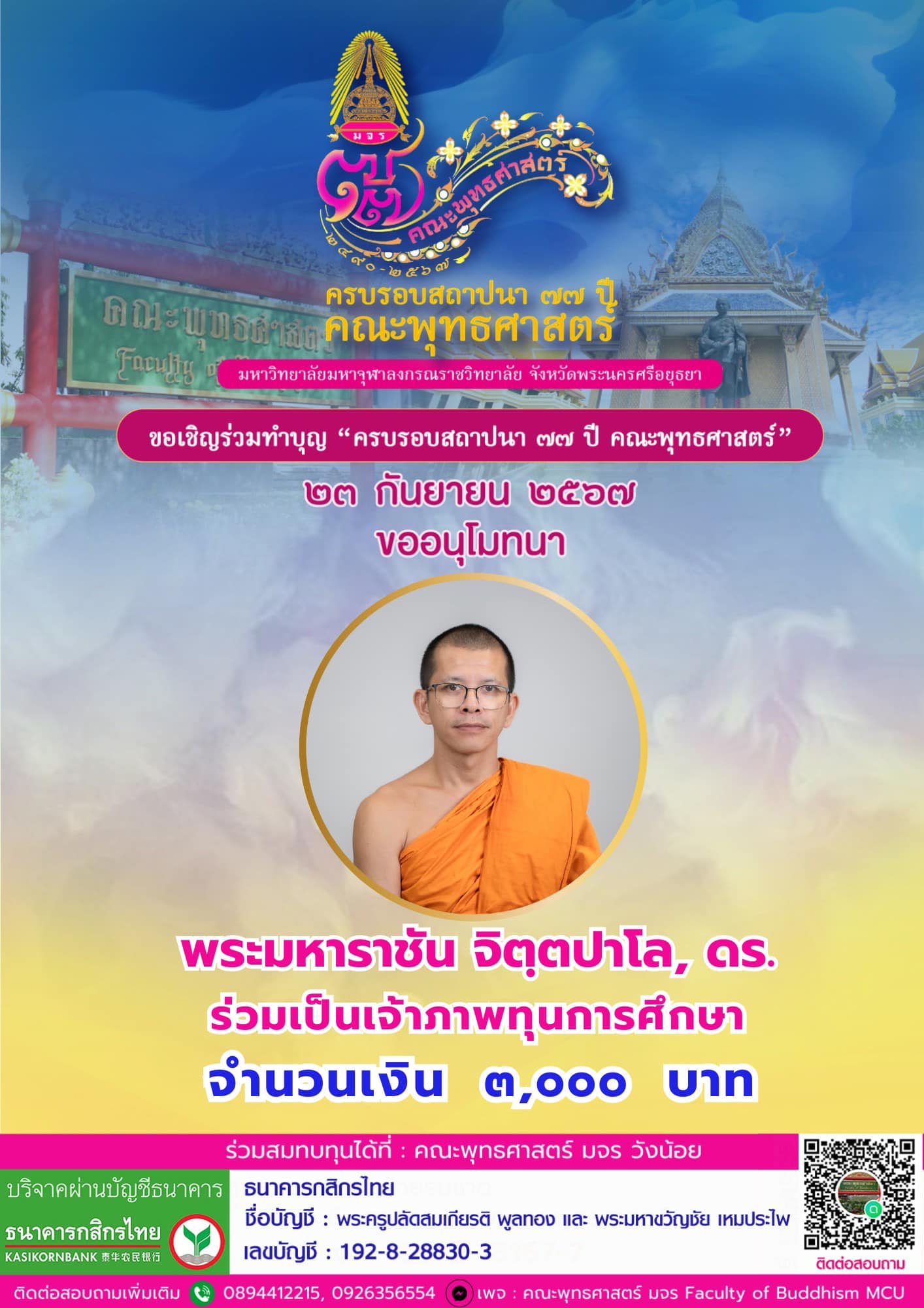 งานครบรอบวันสถาปนา 77 ปี คณะพุทธศาสตร์ กำหนดจัด วันที่ ๒๓ กันยายน ๒๕๖๗ นี้