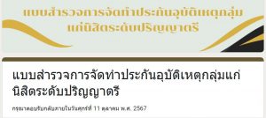 ด้วยภาระหน้าที่ ดังกล่าว มหาวิทยาลัยได้มุ่งความสำคัญในการให้การบริการนิสิตด้านสวัสดิการตามแนวนโยบายของมหาวิทยาลัยให้สอดคล้องกับสวัสดิการภาครัฐ จึงได้ออกแบบสำรวจการจัดทำอุบัติเหตุกลุ่ม เพื่อจัดทำฐานข้อมูลด้านสวัสดิการนิสิตระดับปริญญาตรี จึงขอความร่วมมือจากส่วนงานที่จัดการศึกษาระดับปริญญาตรี และฝ่ายกิจการนิสิตทุกแห่ง กรุณาตอบแบบสำรวจภายในวันที่ 11 ตุลาคม 2567 (เพื่อจัดทำข้อมูลรายงานมหาวิทยาลัย) ขอบพระคุณที่ให้ความร่วมมือ