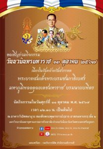 ขอเชิญเข้าร่วมกิจกรรมน้อมรำลึกในพระมหากรุณาธิคุณ เนื่องในวันนวมินทรมหาราช ๑๓ ตุลาคม วันคล้ายวันสวรรคตพระบาทสมเด็จพระบรมชนกาธิเบศร