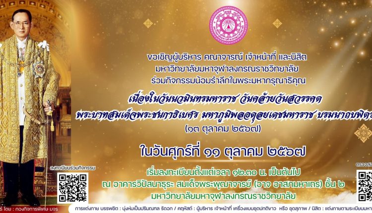 ขอเชิญผู้บริหาร คณาจารย์ เจ้าหน้าที่ และนิสิต มหาวิทยาลัยมหาจุฬาลงกรณราชวิทยาลัย เข้าร่วมกิจกรรมน้อมรำลึกในพระมหากรุณาธิคุณ