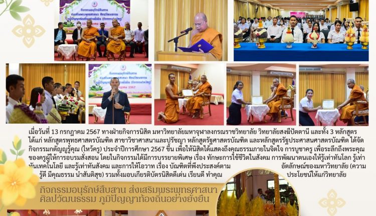 ฝ่ายกิจการนิสิต มหาวิทยาลัยมหาจุฬาลงกรณราชวิทยาลัย วิทยาลัยสงฆืปัตตานี ร่วมกับ หลักสูตร ได้แก่ หลักสูตรพุทธศาสตรบัณฑิต สาขาวิชาศาสนาและปรัชญา หลักสูตรัฐศาสตรบัณฑิต และหลักสูตรรัฐประศาสนศาสตรบัณฑิต ได้จัดกิจกรรมกตัญญูรู้คุณ (ไหว้ครู) ประจำปีการศึกษา 2567 ขึ้น เพื่อให้นิสิตได้แสดงถึงคุณธรรมภายในจิตใจ การบูชาครู เพื่อระลึกถึงพระคุณของครูผู้ให้การอบรมสั่งสอน