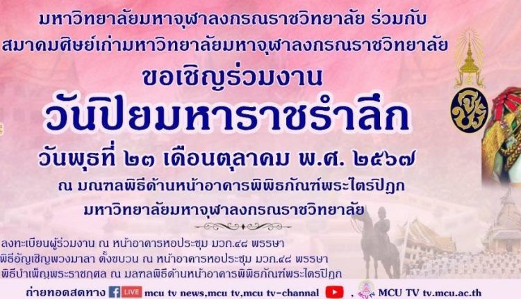 ขอเชิญลงทะเบียนเข้าร่วมงานวันปิยมหาราชรำลึก ๒๕๖๗ ในวันพุธที่ ๒๓ ตุลาคม ๒๕๖๗ ณ มณฑลพิธีด้านหน้าอาคารพิพิธภัณฑ์พระไตรปิฎก มหาวิทยาลัยมหาจุฬาลงกรณราชวิทยาลัย
