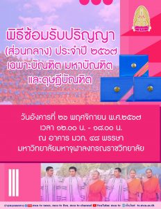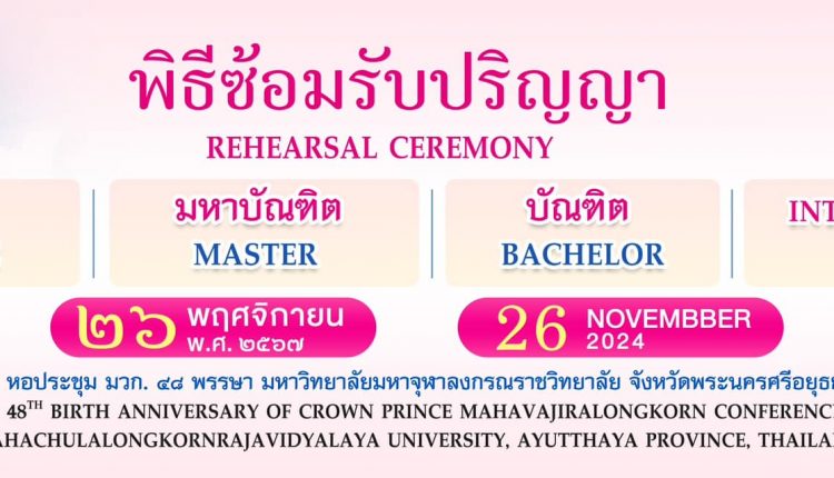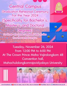ประชาสัมพันธ์ พิธีซ้อมรับปริญญา (ส่วนกลาง )ประจำปี ๒๕๖๗ วันที่ ๒๖ พฤศจิกายน พ.ศ.๒๕๖๗ By บัญชา นารี Last updated พ.ย. 25, 2024 28 Share พิธีซ้อมรับปริญญา (ส่วนกลาง )ประจำปี ๒๕๖๗วันที่ ๒๖ พฤศจิกายน พ.ศ.๒๕๖๗เวลา ๑๒.๐๐ – ๑๘.๐๐ น.ณ อาคาร มวก.๔๘ พรรษามหาวิทยาลัยมหาจุฬาลงกรณราชวิทยาลัย พระนครศรีอยุธยา ขอเชิญบัณฑิต ดาวน์โหลดเลขที่นั่ง เพื่อแสดงหลักฐานเข้าเข้าพิธีซ้อมใหญ่รับปริญญา (มจร ส่วนกลาง) 26 พฤศจิกายน 2567 Invitation all graduates Download seat number to show in the rehearsal ceremony, graduation (MCU main campus) November 26, 2024 https://grad-reg.mcu.ac.th 28 Share FacebookEmail