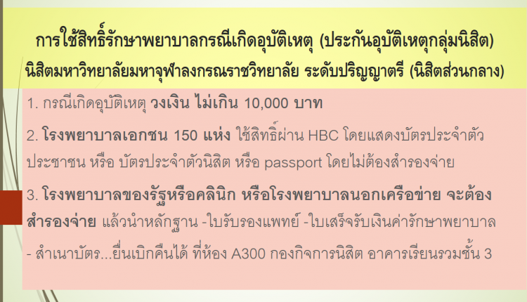 การใช้สิทธิ์รักษาพยาบาลกรณีเกิดอุบัติเหตุ นิสิต มจร ระดับปริญญาตรี (ส่วนกลาง)