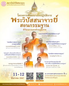 พระวิปัสสนาจารย์ที่ได้รับแต่งตั้งให้ทำหน้าที่สอนธรรมนำปฏิบัติและดูแลการปฏิบัติธรรมของนิสิต มจร ทุกคณะ ทุกวิทยาเขต วิทยาลัยสงฆ์ เข้าร่วมสัมมนา ภายใต้ โครงการสัมมนาเชิงปฏิบัติการพระวิปัสสนาจารย์สอนกัมมัฏฐานส่วนกลางและส่วนภูมิภาค ระหว่าง วันที่ 11 – 12 ธันวาคม 2567 จัดโดย สถาบันวิปัสสนาธุระ