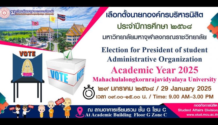 ขอเชิญนิสิต ป.ตรี มจร เข้าใช้สิทธิ์เลือกตั้ง นายกองค์กรบริหารนิสิต มจร ประจำปี 2568