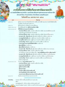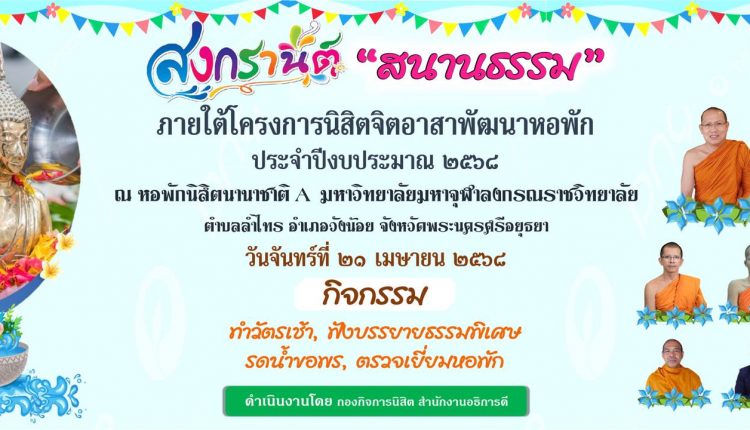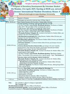 งานสวัสดิการนิสิต ขอเชิญร่วมกิจกรรม “สงกรานต์ สนานธรรม” “Songkran asking the blessing of Student Dormitory MCU” Program of Dormitory Development By Volunteer Student On Monday, 21st April, 2025, Starting at 08.00 a.m. onward By บัญชา นารี On เม.ย. 19, 2025 10 Share ขอเชิญผู้บริหาร บุคลากร เจ้าหน้าที่และ นิสิต ร่วมกิจกรรม “สงกรานต์ สนานธรรม” ภายใต้โครงการ นิสิตจิตอาสาพัฒนาหอพักณ อาคารหอพักนิสิตนานาชาติ เอ จัดโดย กองกิจการนิสิต สำนักงานอธิการบดี มหาวิทยาลัยมหาจุฬาลงกรณราชวิทยาลัย อำเภอวังน้อย จังหวัดพระนครศรีอยุธยา วันจันทร์ที่ 21 เมษายน 2568 ตั้งแต่เวลา 08.30 น. เป็นต้นไป “Songkran asking the blessing of Student Dormitory MCU” Program of Dormitory Development By Volunteer Student On Monday, 21st April, 2025, Starting at 08.00 a.m. onward Avenue International Student Dormitory House A Grand opening ceremony and special Speech overall. – The Most Venerable Assoc.Prof.Dr. PhraDhamvajirodom, Vice-Rector of Student Affairs MCU, 10 Share FacebookEmail