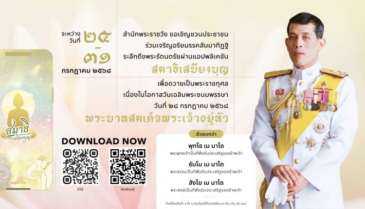 ถวายเป็นพระราชกุศลเนื่องในโอกาสวันเฉลิมพระชนมพรรษาพระบาทสมเด็จพระเจ้าอยู่หัว ระหว่างวันที่ ๒๕ กรกฎาคม ๒๕๖๘ เวลา ๐๘.๐๐ น. ถึง วันที่ ๓๑ กรกฎาคม ๒๕๖๘ เวลา ๐๘.๐๐ น. ทั้งนี้ สามารถดาวน์โหลดแอปพลิเคชันได้ทั้ง PLAY STORE และ APP STORE