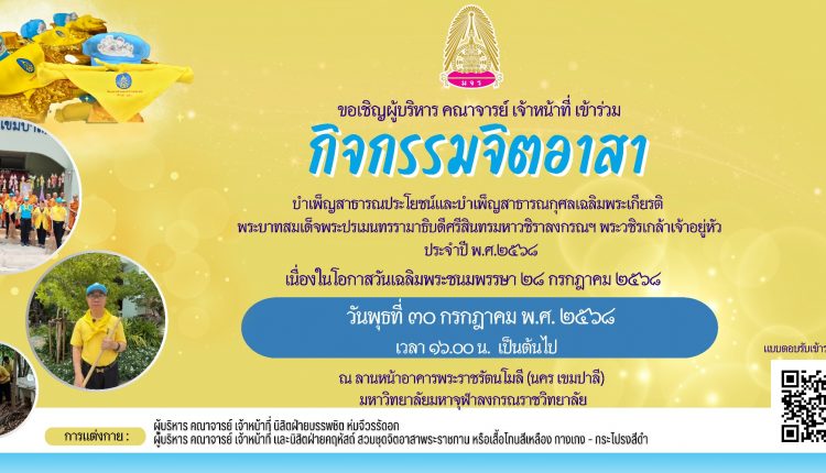 ขอเชิญผู้บริหาร คณาจารย์ เจ้าหน้าที่ เข้าร่วมกิจกรรมจิตอาสาบำเพ็ญสาธารณประโยชน์และบำเพ็ญสาธาธารณกุศล