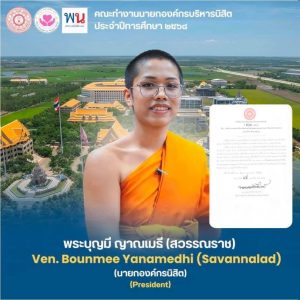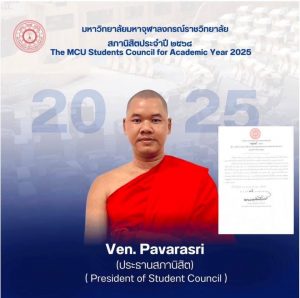 Two venerable students, one from Lao PDR elected President of MCU Student Government Organization, Ven Bounmee Savanlad, and another one, Ven Pavarasri from Myanmar elected Chair of MCU Student Council for the academic year 2025, are both the third-year students of Faculty of Humanities, MCU Wang Noi, Ayutthaya.