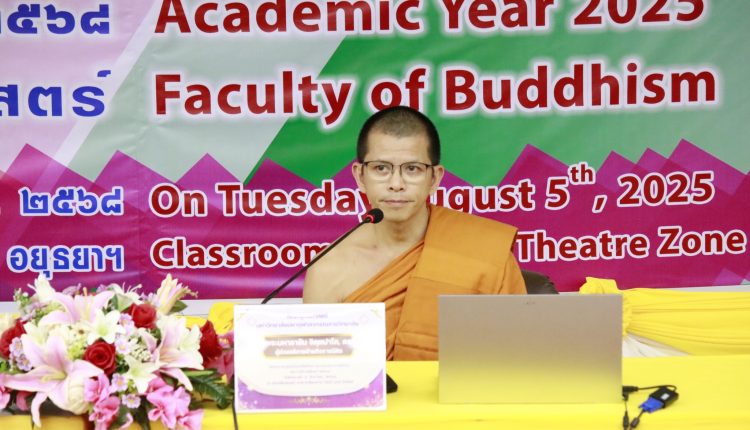 ผู้ช่วยอธิการบดีฝ่ายกิจการนิสิต แนะนำแนวทางการรับบริการจากกองกิจการนิสิต ในพิธีปฐมนิเทศนิสิตใหม่และแนะแนวการศึกษา ประจำปีการศึกษา ๒๕๖๘ คณะพุทธฯ