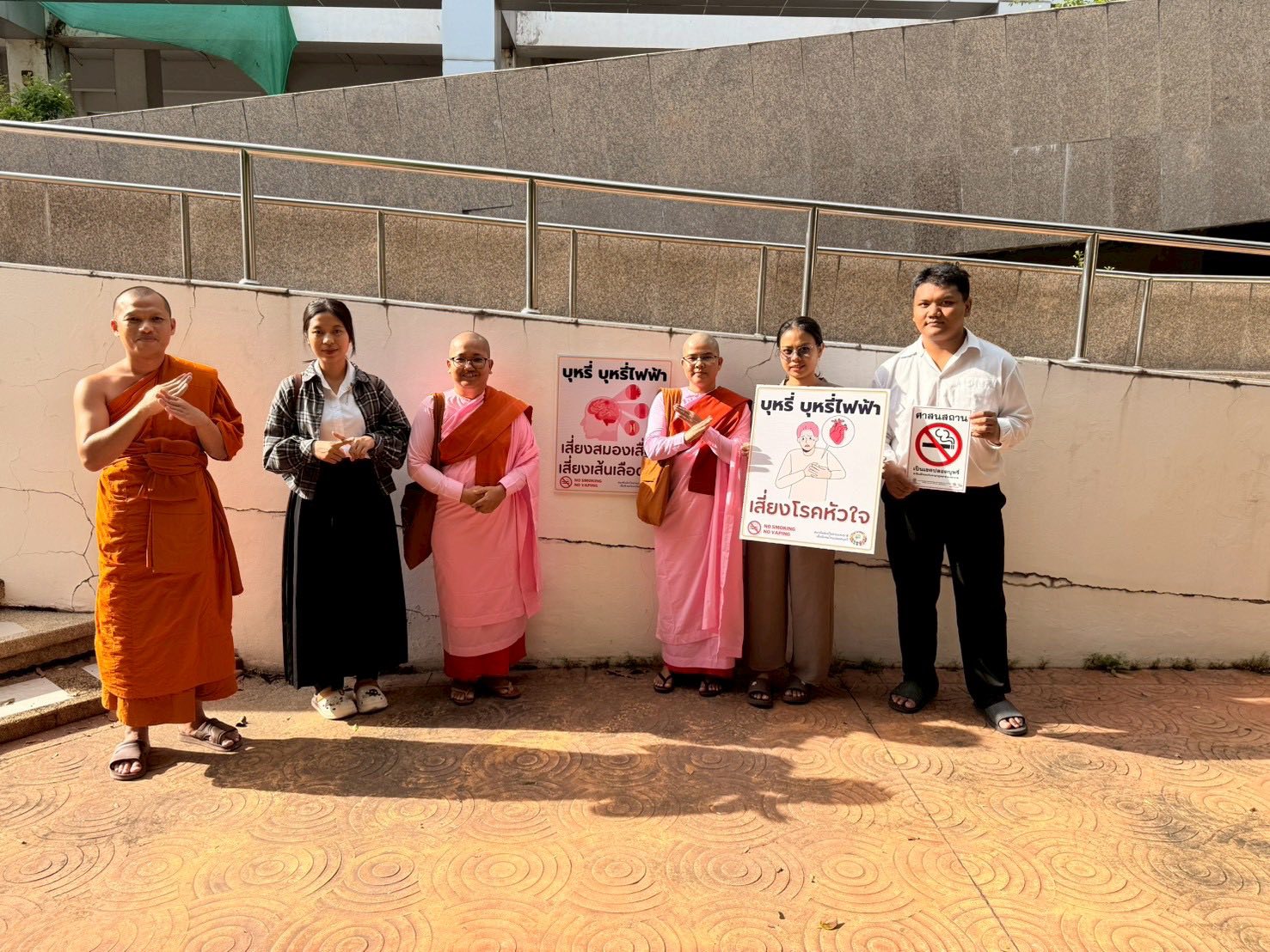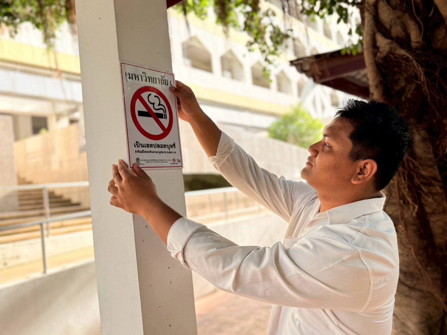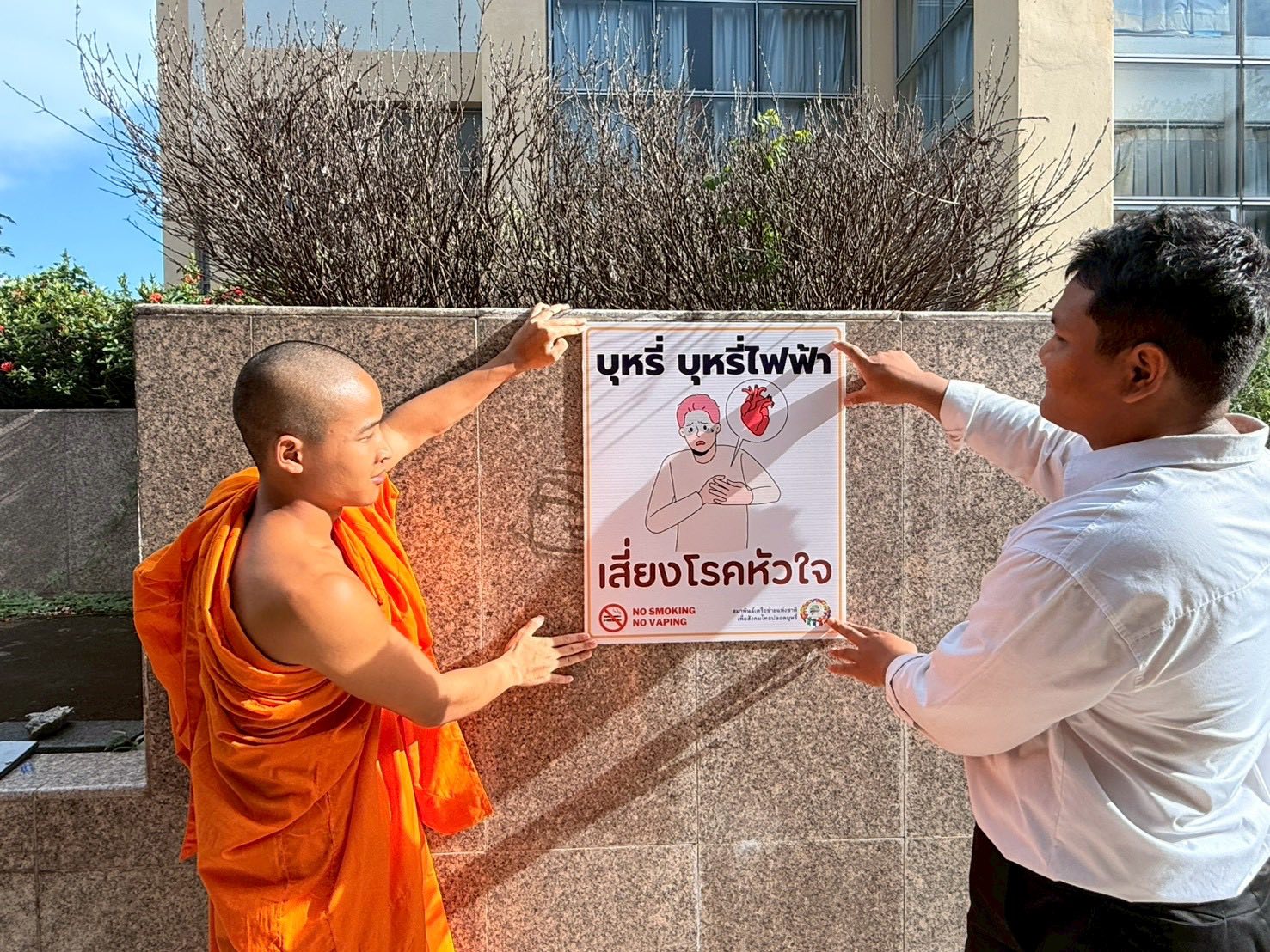 ❝ ประธานชมรมรณรงค์เพื่อการไม่สูบบุหรี่ มจร และนิสิตจิตอาสาติดป้ายประชาสัมพันธ์ห้ามสูบบุหรี่❞