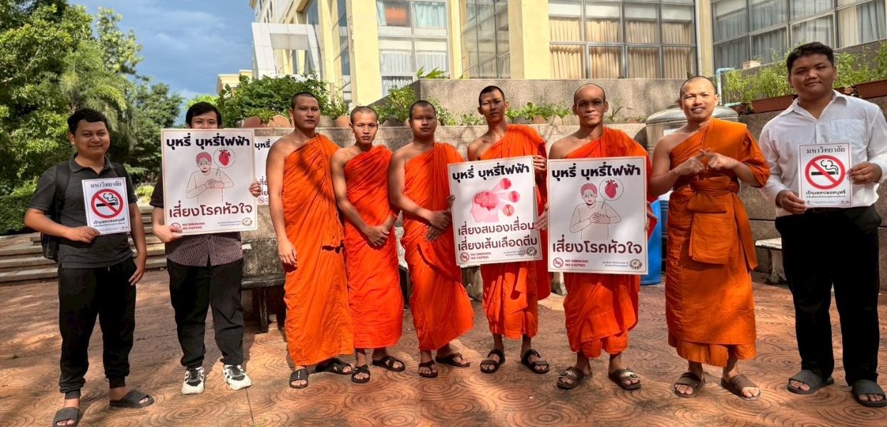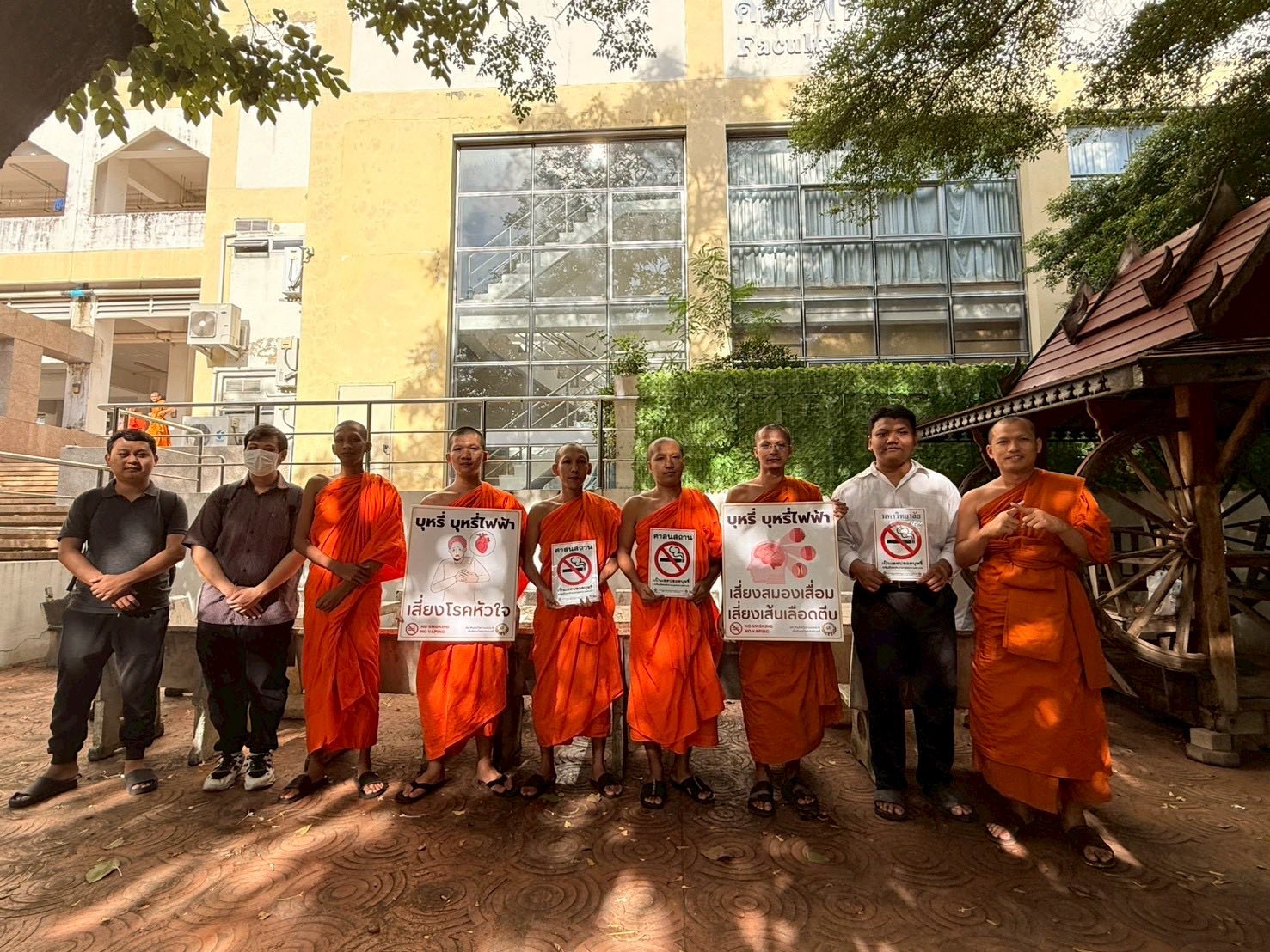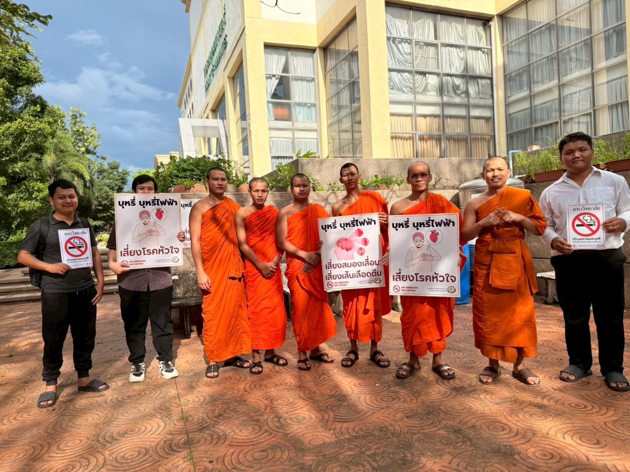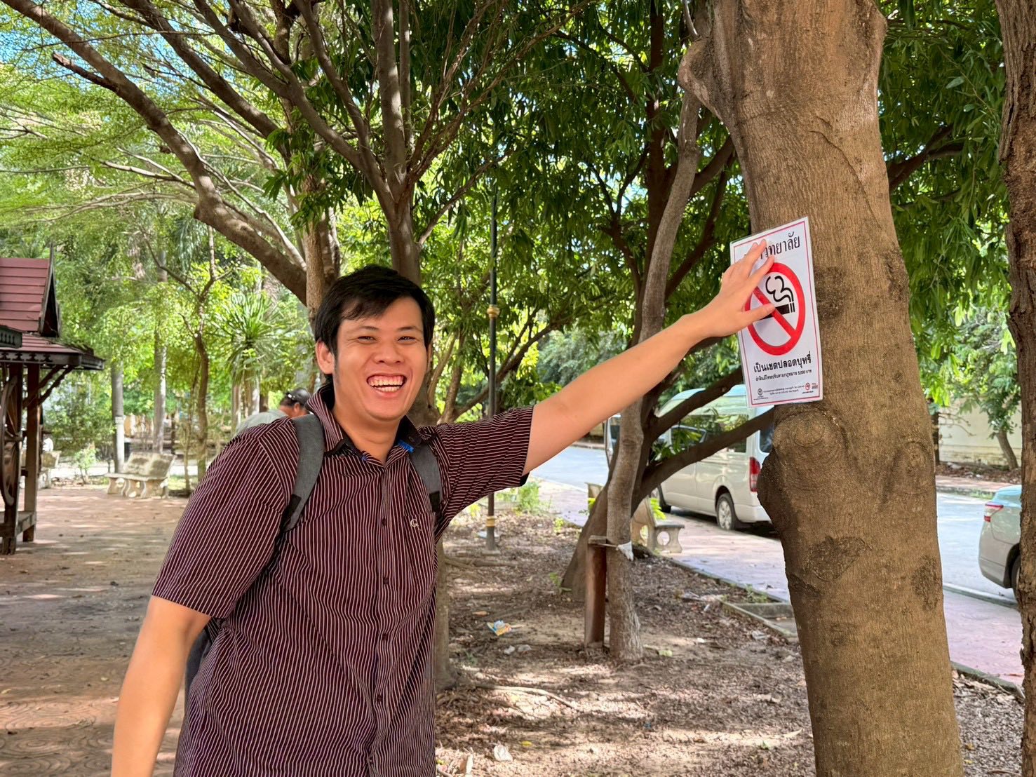 ❝ ประธานชมรมรณรงค์เพื่อการไม่สูบบุหรี่ มจร และนิสิตจิตอาสาติดป้ายประชาสัมพันธ์ห้ามสูบบุหรี่❞