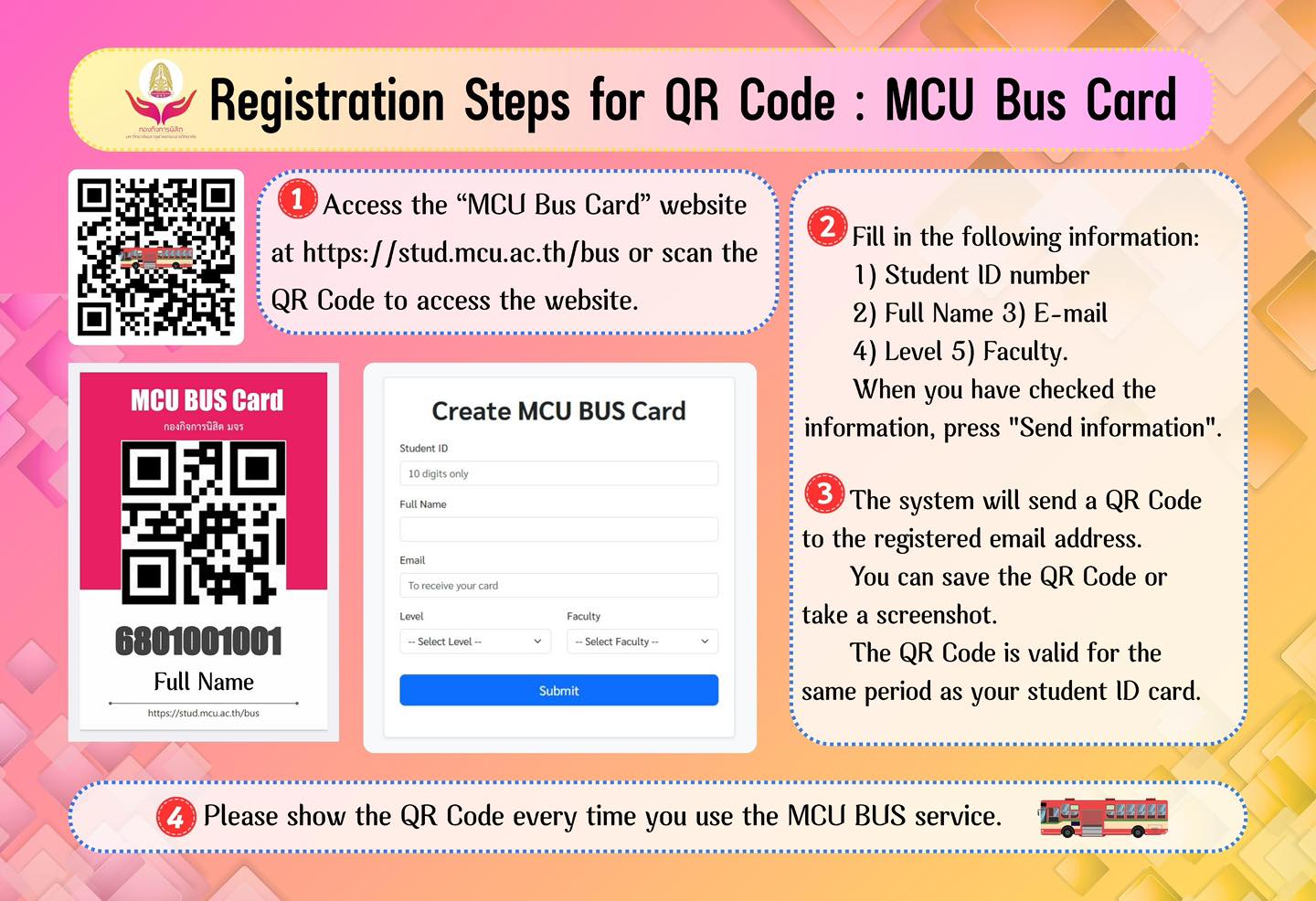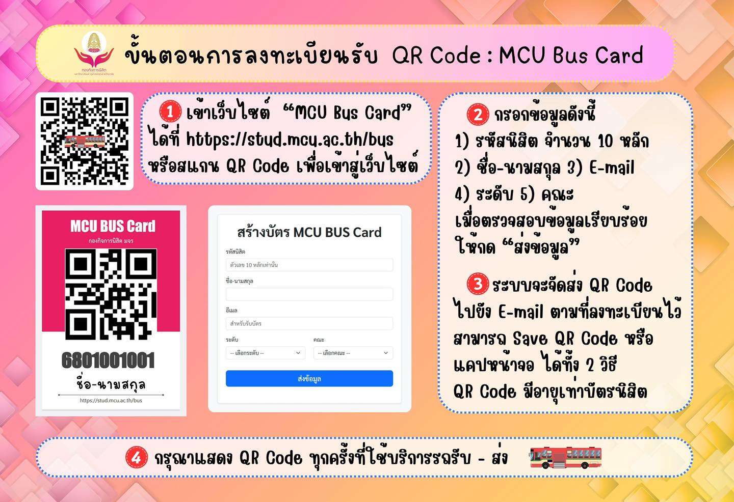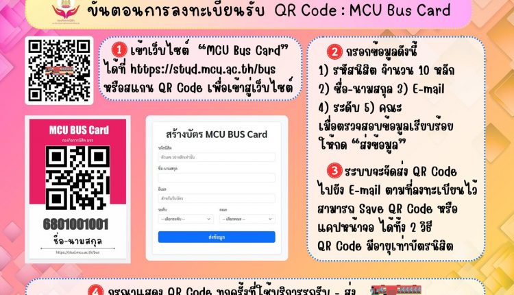ประกาศให้นิสิตที่โดยสารรถเมล์บริการรับ-ส่งนิสิต มจร ลงทะเบียนรับบัตรโดยสารรถเมล์ (MCU Bus Card)
