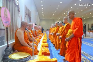 พระสงฆ์สมณศักดิ์ ๑๐ รูป สวดพระพุทธมนต์ ผู้บริหารมหาวิทยาลัย ถวายเครื่องไทยธรรม และทอดผ้าไตรบังสุกุล พระสงฆ์อนุโมทนา
