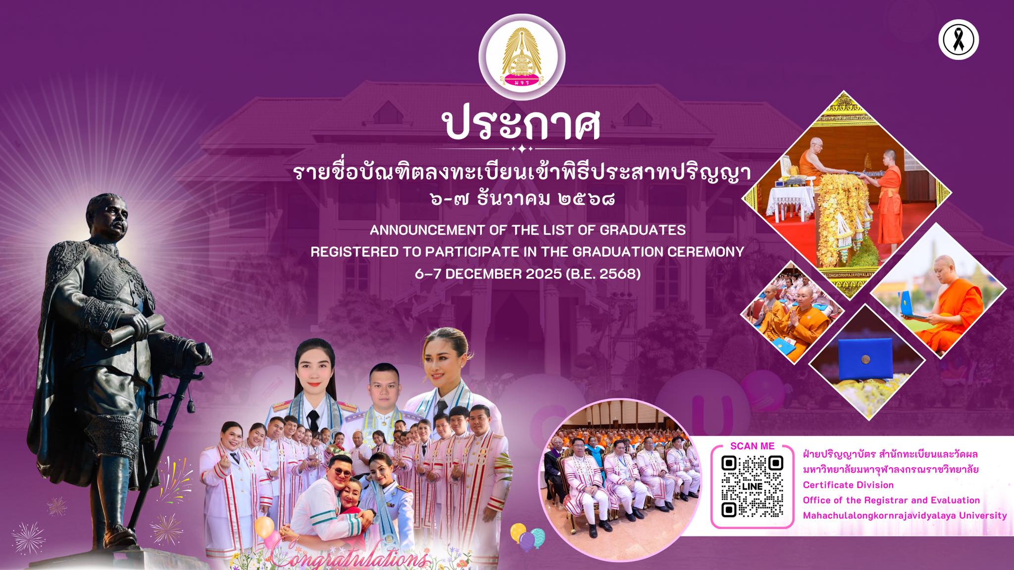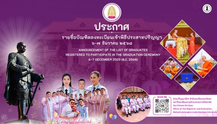 ฝ่ายปริญญาบัตร สำนักทะเบียนและวัดผล ประกาศรายชื่อบัณฑิต ลงทะเบียนเข้าพิธีประสาทปริญญา ๖-๗ ธันวาคม ๒๕๖๘ Announcement of the List of Graduates Registered to Participate in the Graduation Ceremony 6–7 December 2025 (B.E. 2568)