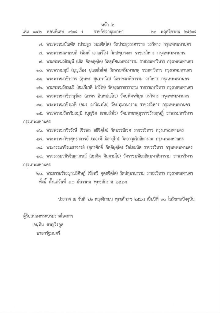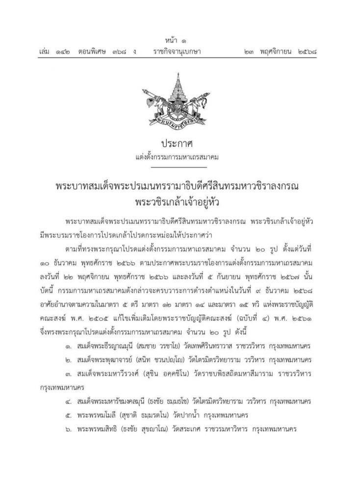 ราชกิจจานุเบกษาเผยแพร่พระบรมราชโองการ รัชกาลที่ 10 แต่งตั้งกรรมมหาเถรสมาคม 20 รูป