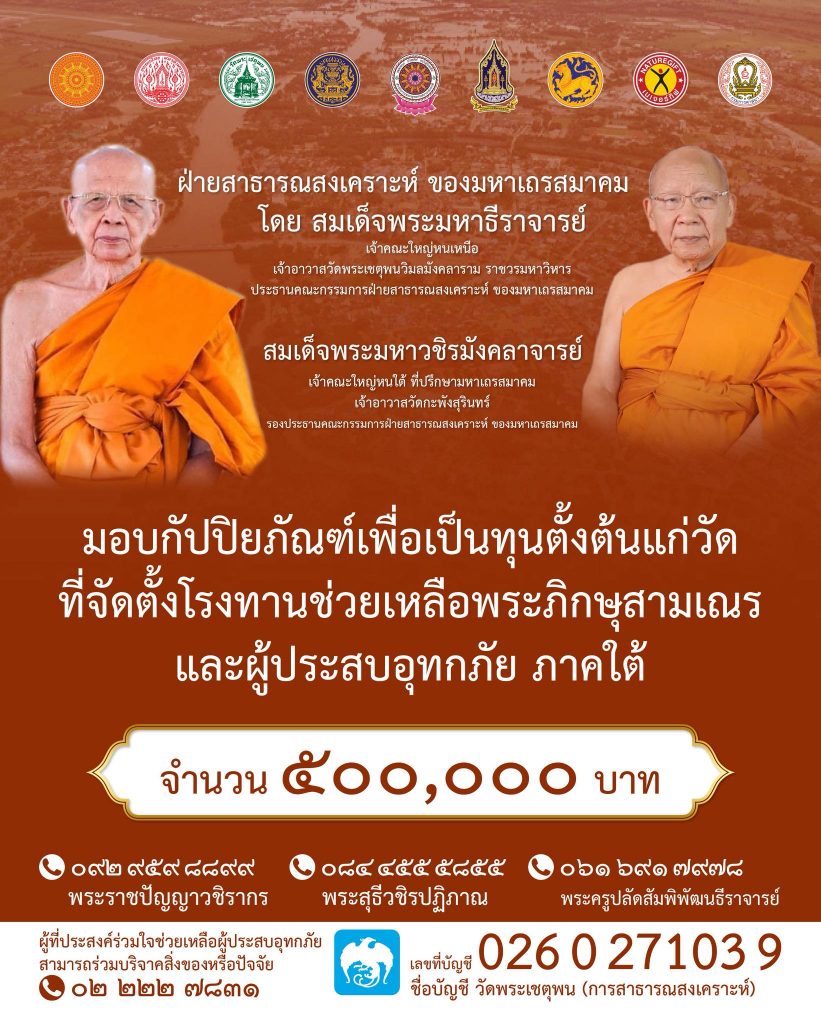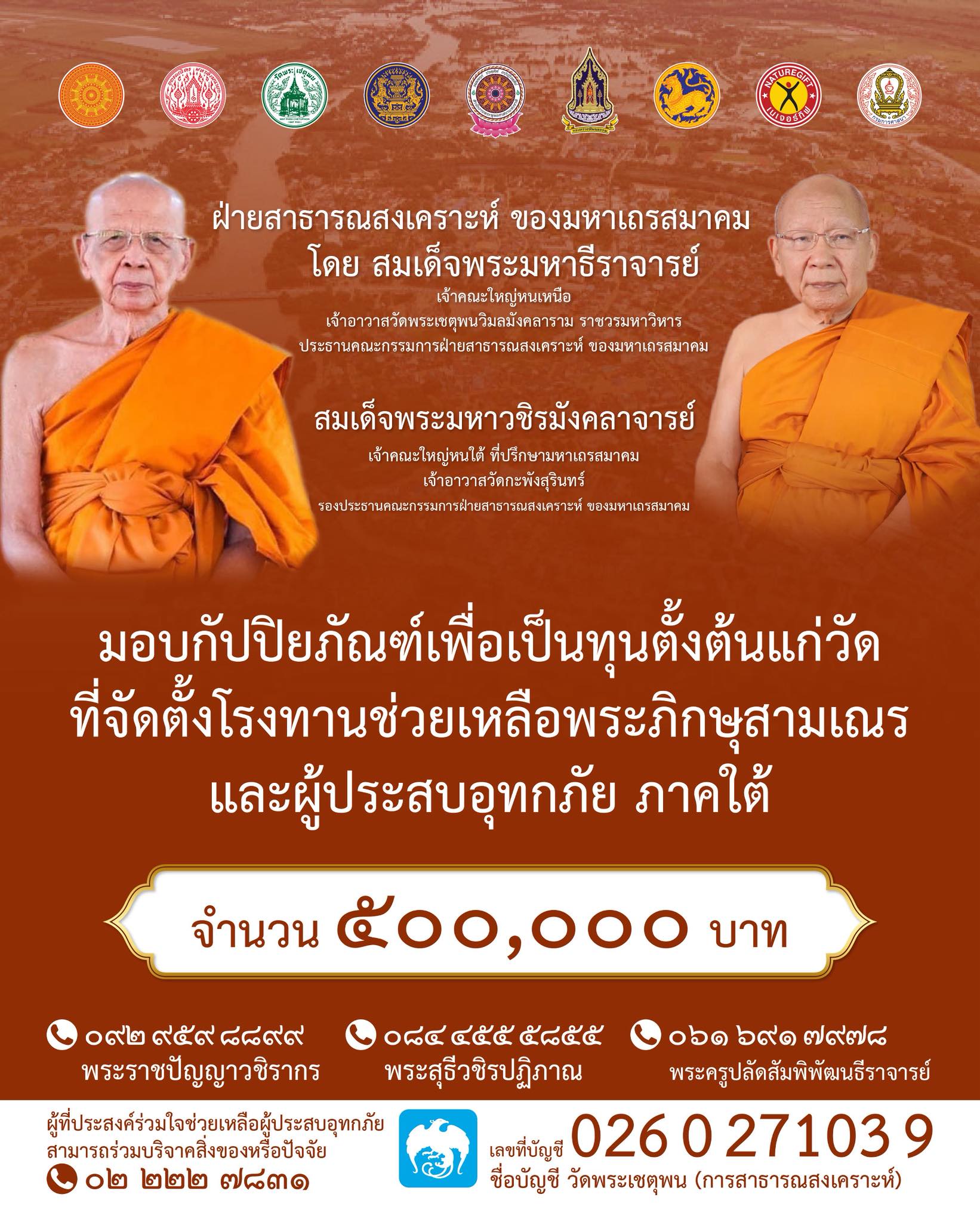 มอบกัปปิยภัณฑ์เพื่อเป็นทุนตั้งต้นแก่วัด ที่จัดตั้งโรงทานช่วยเหลือพระภิกษุสามเณร และผู้ประสบอุทกภัย ภาคใต้ จำนวน ๕๐๐,๐๐๐ บาท