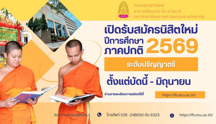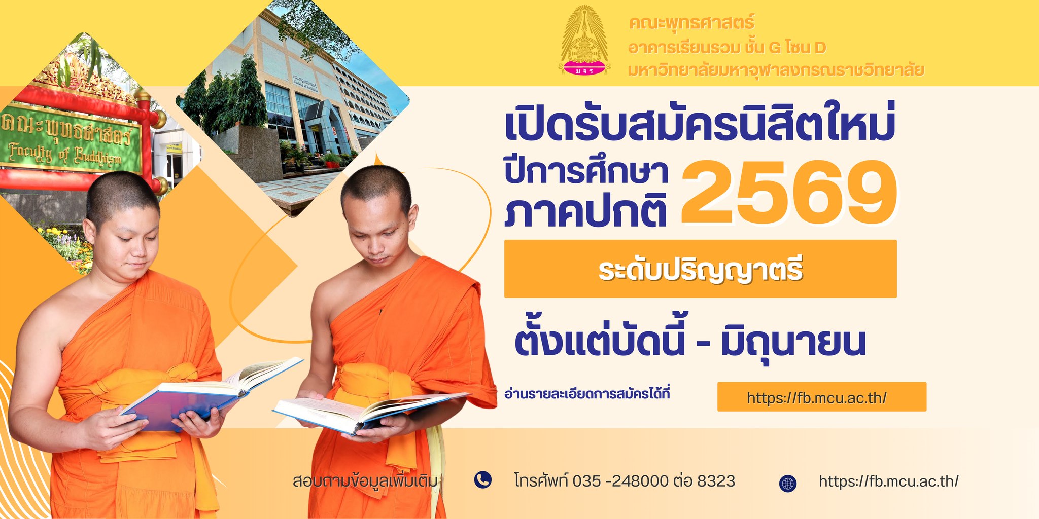 ประชาสัมพันธ์ คณะพุทธศาสตร์ มหาวิทยาลัยมหาจุฬาลงกรณราชวิทยาลัย เปิดรับสมัครนิสิตใหม่ ระดับปริญญาตรี ทั้ง บรรพชิต/คฤหัสถ์ อุบาสก-อุบาสิกา และประชาชนทั่วไป ตั้งแต่บัดนี้ – มิถุนายน 2569 By บัญชา นารี Last updated ธ.ค. 2, 2025 3 Share #คณะพุทธศาสตร์ มหาวิทยาลัยมหาจุฬาลงกรณราชวิทยาลัย เปิดรับสมัครนิสิตใหม่ ระดับปริญญาตรี ทั้ง บรรพชิต/คฤหัสถ์ อุบาสก-อุบาสิกา และประชาชนทั่วไป ตั้งแต่บัดนี้ – มิถุนายน 2569 ระดับปริญญาตรี พธ.บ.(สาขาวิชาพระพุทธศาสนา) พธ.บ.(สาขาวิชาศาสนาและปรัชญา) พธ.บ.(สาขาวิชาบาลีสันสกฤต) พธ.บ.(สาขาวิชาวิปัสสนาภาวนา) B.A. (Buddhist Studies) (English Program) B.A. (Religion and Philosophy) (English Program) ระดับปริญญาโท / Master’s degree พธ.ม. (สาขาวิชาศาสนาเปรียบเทียบ) พธ.ม. (สาขาวิชาพระไตรปิฎกศึกษา) พธ.ม. (สาขาวิชาวิปัสสนาภาวนาศึกษา) ระดับปริญญาเอก / Doctoral degree พธ.ด. (สาขาวิชาศาสนาเปรียบเทียบ) พธ.ด. (สาขาวิชาพระไตรปิฎกศึกษา) ประกาศนียบัตร • สาขาวิชาพระไตรปิฎกกับโลกสมัยใหม่ (ป.ตส.) • สาขาวิชาวิปัสสนาภาวนา (ป.วน.) • สาขาวิชาพุทธปรัชญาเวชกรรมไทย • สาขาวิชาภาษาบาลี (ป.บล) สมัครเรียนง่าย ๆ ผ่านระบบออนไลน์ สมัครออนไลน์ได้ที่ http://regweb.mcu.ac.th/registrar/apphome.asp ดูวิธีการสมัครเรียนออนไลน์ https://youtu.be/5L3gGzGvYfs ข้อมูลเพิ่มเติม https://fb.mcu.ac.th/ สอบถามเพิ่มเติม ติดต่อสอบถามรายละเอียด สำนักทะเบียนและวัดผล ห้อง C300 ชั้น ๓ อาคารเรียนรวม โซน C มหาวิทยาลัยมหาจุฬาลงกรณราชวิทยาลัย ตำบลลำไทร อำเภอวังน้อย จังหวัดพระนครศรีอยุธยา คณะพุทธศาสตร์ มหาวิทยาลัยมหาจุฬาลงกรณราชวิทยาลัย 3 Share FacebookEmail
