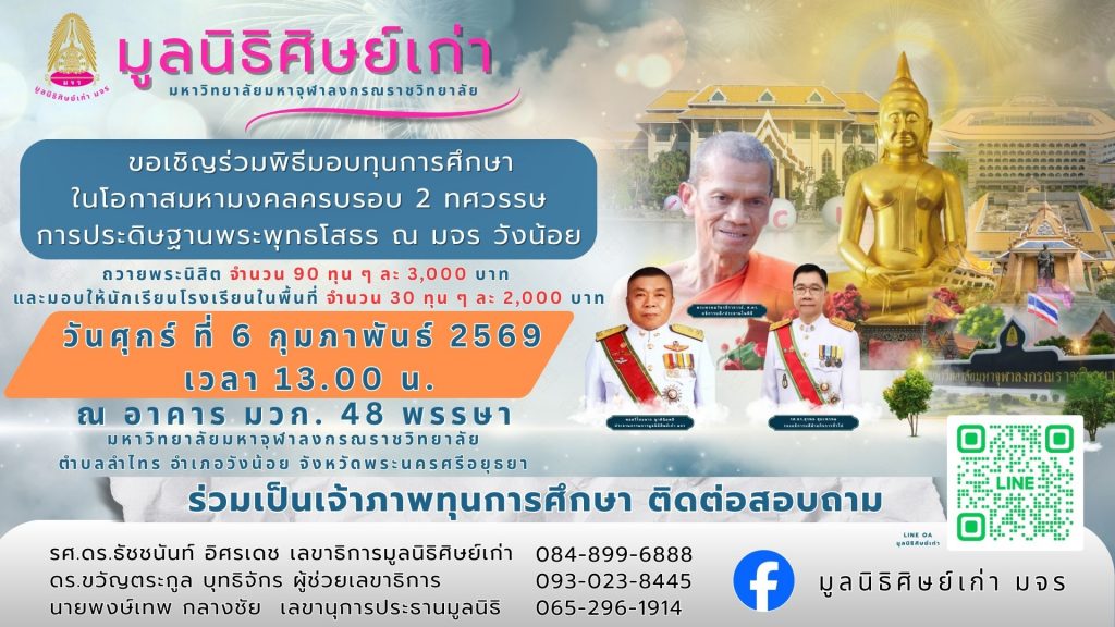 มูลนิธิศิษย์เก่า มจร ขอเชิญร่วมพิธีมอบทุนการศึกษา วันศุกร์ที่ 6 กุมภาพันธ์ พ.ศ. 2569