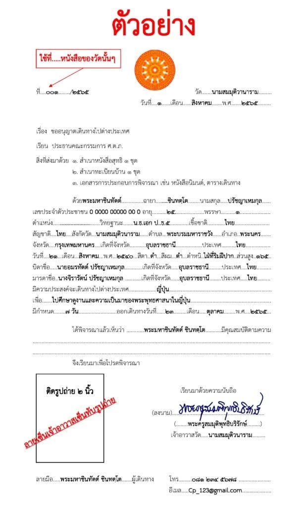 หมายเหตุ.- การจัดทำแบบเอกสารเพื่อขออนุญาตเดินทางไปต่างประเทศสำหรับพระภิกษุสามเณร ขอให้จัดทำ ๓ ชุด ดังนี้