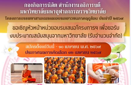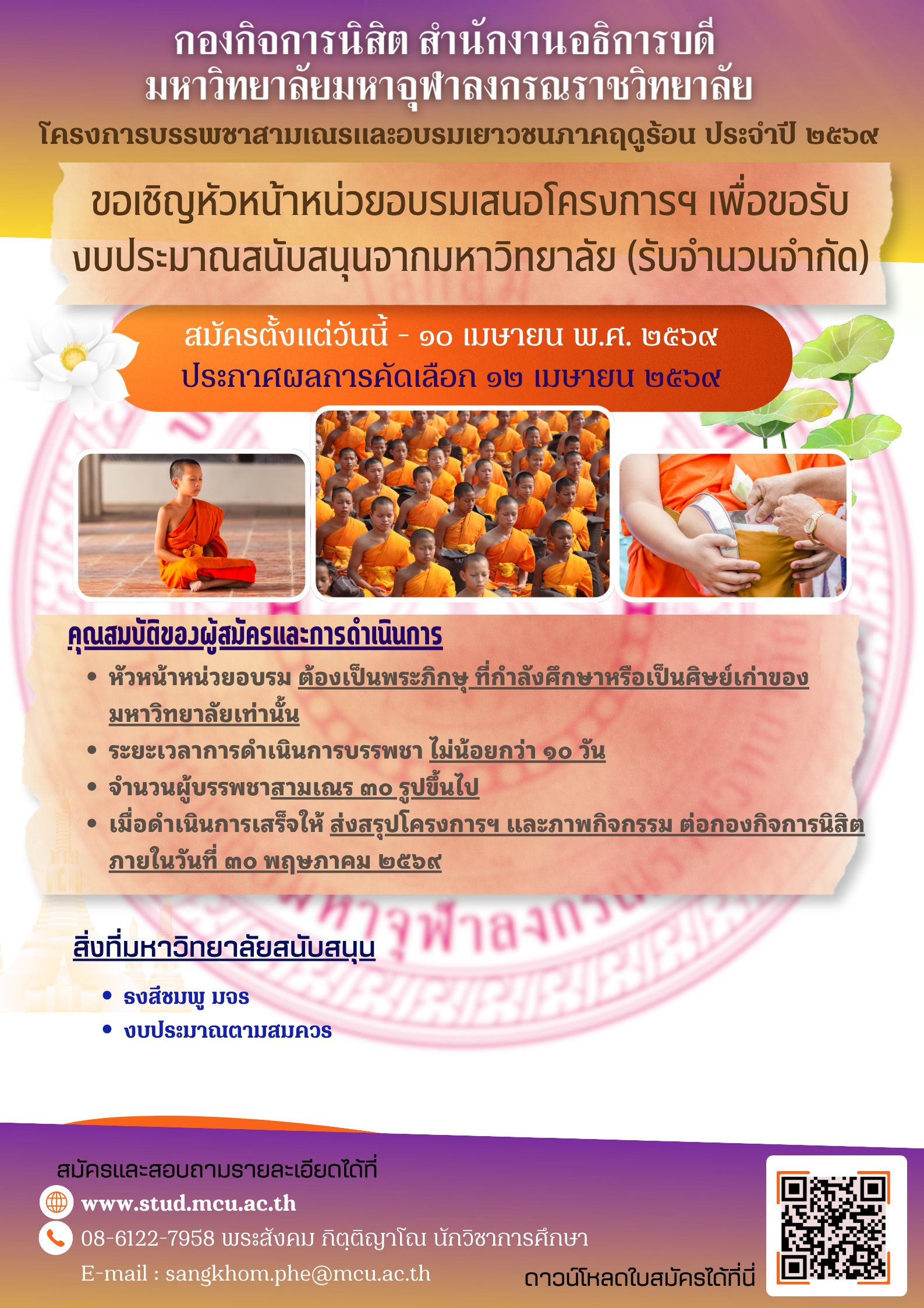 ขอเชิญนิสิตหรือศิษย์เก่า มจร เสนอโครงการบรรพชาสามเณรฯ เพื่อขอรับงบประมาณสนับสนุนจากมหาวิทยาลัย