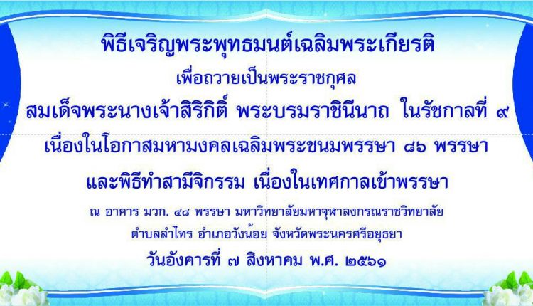 พิธีเจริญพระพุทธมนต์เฉลิมพระเกียรติ สมเด็จพระนางเจ้าสิริกิติ์ พระบรมราชินีนาถ ในรัชกาลที่ 9 เนื่องในโอกาสมหามงคลเฉลิมพระชนมพรรษา 86 พรรษา 12 สิงหาคม 2561