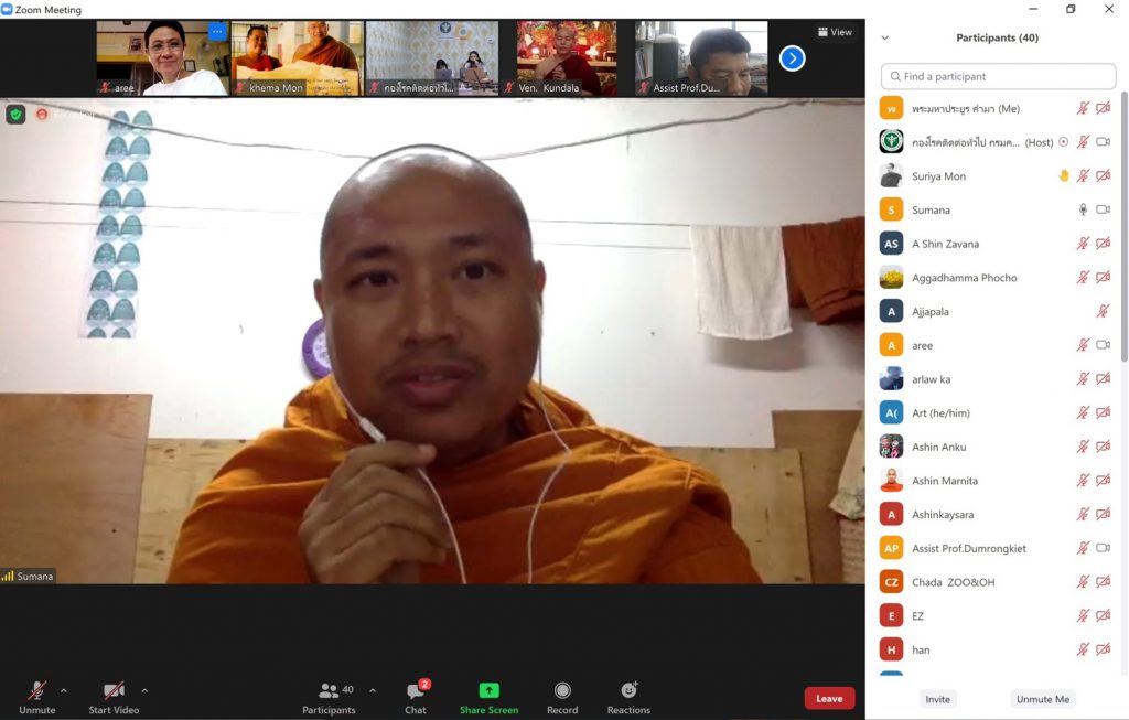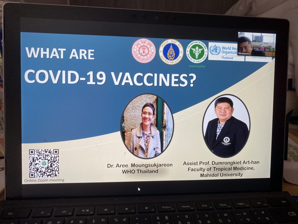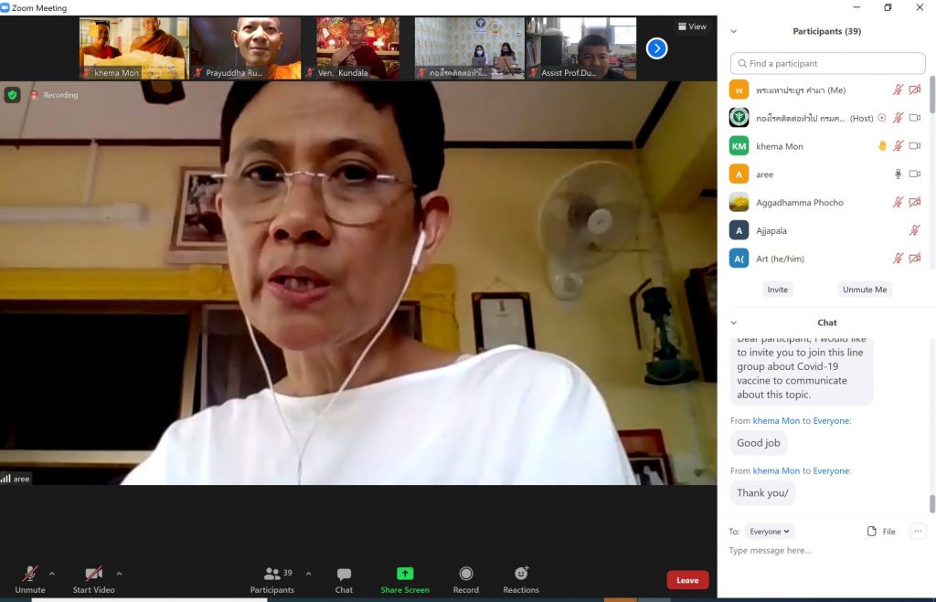 การบรรยายถวายความรู้โดย ดร. อารีย์ ม่วงสุขเจริญ เจ้าหน้าที่องค์การอนามัยโลกประจำประเทศไทย วิทยากรได้บรรยาย เรื่อง “Introduction to COVID-19 Vaccines” เป็นการทำความเข้าใจและให้ข้อมูลเกี่ยวกับสถานการณ์โควิด-19 ระลอกสามและวัคซีนโดยการบรรยายได้เปิดโอกาสให้มีการซักถาม ซึ่งได้รับความสนใจจากผู้เข้าร่วมอบรมออนไลน์เป็นอย่างยิ่ง มีการซักถามแลกเปลี่ยนและร่วมหาแนวทางในการดำเนินงานครั้งต่อไป เช่น ให้พระนิสิตสรุปความรู้สั้นๆที่ได้รับจากการประชุมวันนี้ แนวทางการผลิตสื่อโควิด -19 ทั้งสื่ออินโฟกราฟิกแปลภาษา สื่อวิดีโอวิชาการกึ่งสารคดี และการสื่อสารผ่านช่องทางต่าง ๆ