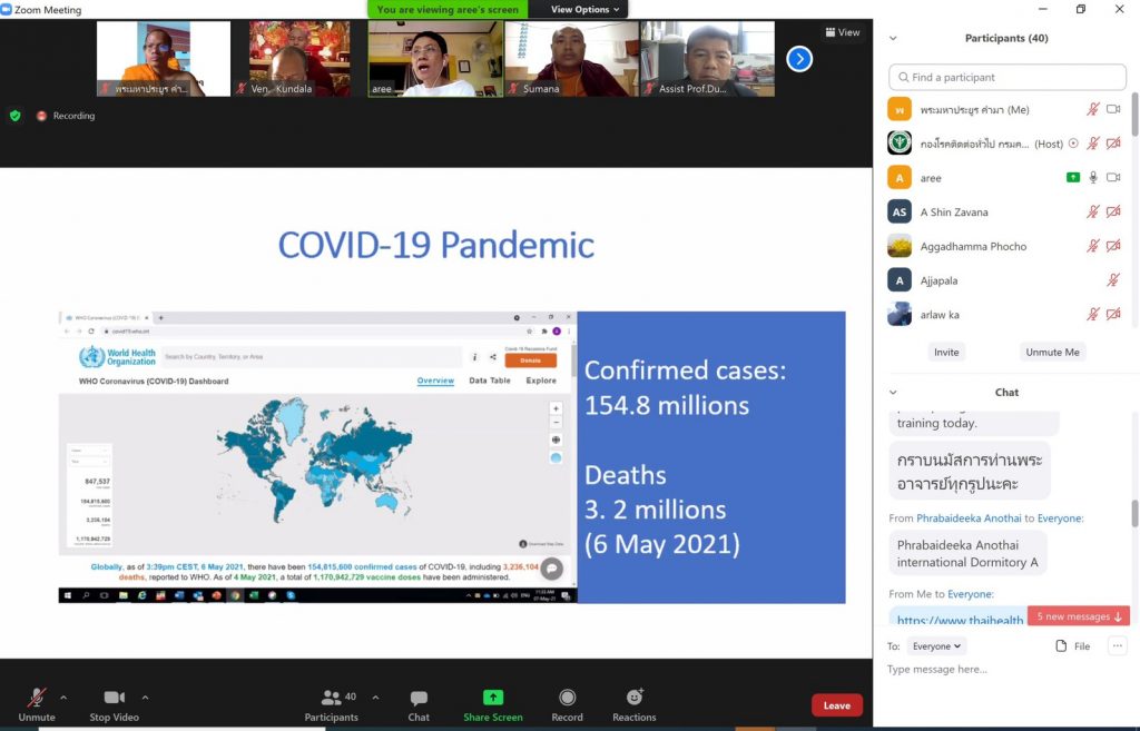 “มจร สสส. กรมควบคุมโรค มหาวิทยาลัยมหิดล และ WHO ร่วมจัดอบรมเชิงปฏิบัติ (ออนไลน์) ถวายความรู้เรื่องโควิด-19 และวัคซีนแก่นิสิตชาวต่างประเทศ มจร “