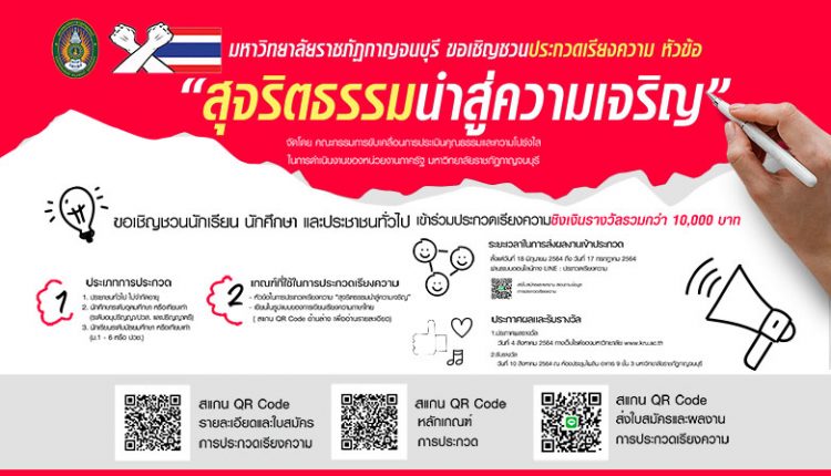 มหาวิทยาลัยราชภัฏกาญจนบุรี ร่วมต่อต้านคอร์รัปชันทุกรูปแบบ ขอเชิญชวนนักเรียน นักศึกษา และประชาชนทั่วไป ร่วมส่งผลงานการประกวดเรียงความ ในหัวข้อ“สุจริตธรรมนำสู่ความเจริญ” ชิงเงินรางวัลรวมกว่า 10,000 บาท พร้อมเกียรติบัตร
