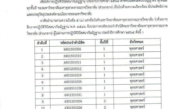 “ประกาศรหัสนิสิตผู้ไม่ผ่านการปฏิบัติธรรม (ส่วนกลาง) ประจำปีการศึกษา ๒๕๖๔”