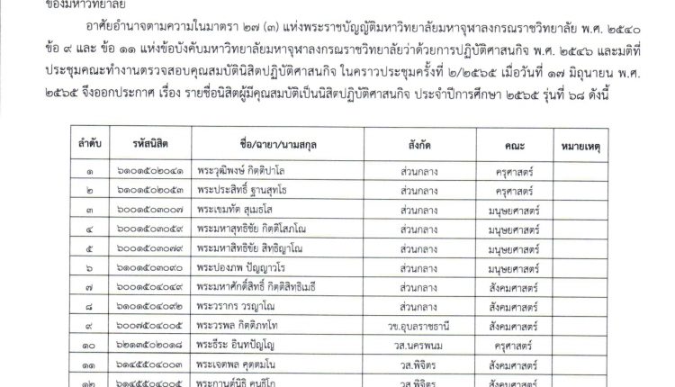 ประกาศรายชื่อนิสิตผู้มีคุณสมบัติเป็นนิสิตปฏิบัติศาสนกิจ (รอบ 2) ประจำปีการศึกษา ๒๕๖๕ รุ่นที่ ๖๘